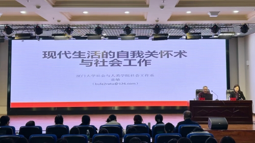 为深化社会工作专业学术交流,助力师生探索自我关怀与专业实践的融合路径,12月6日下午,学院邀请全国社会工作专业学位教育指导委员会委员、中国社会工作教育协会副理事长、厦门大学博士生导师童敏教授作了题为《现代生活中的自我关怀与社会工作》的学术报告,报告由人文学院院长曹景萍主持,共160余名教师和学生参加本次交流活动。童敏教授作学术报告报告中,童敏教授结合当代社会快节奏生活下的心理压力现状,系统阐释了自我关怀的核心内涵、科学方法及其在缓解焦虑、提升心理韧性中的重要作用。他从社会工作专...