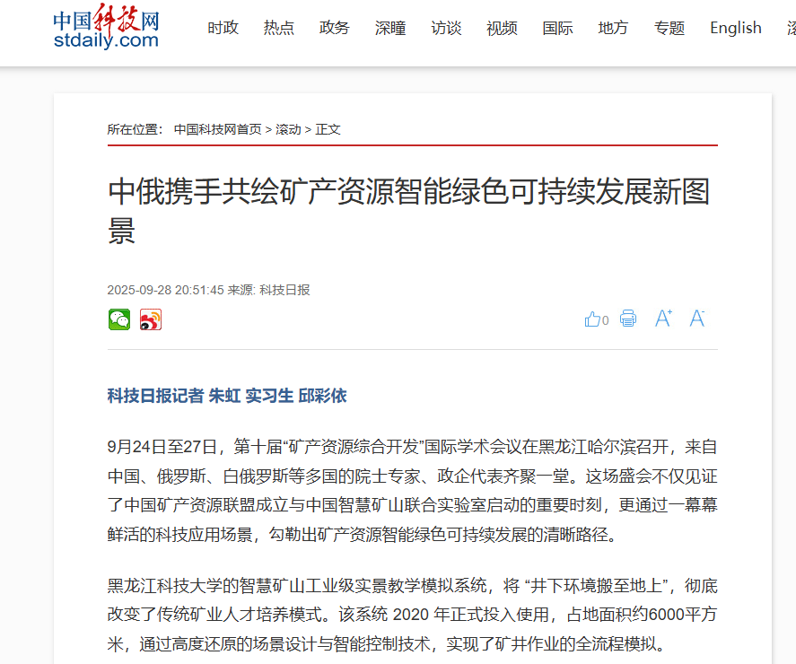 9月24日—27日,由我校与俄罗斯科学院哈巴罗夫斯克研究中心联合主办的第十届“矿产资源综合开发”国际学术会议在哈尔滨成功召开。会议聚焦矿产资源综合开发前沿领域,吸引国内外矿产资源领域专家学者、企业代表齐聚冰城,共探资源开发利用创新路径与未来趋势。《科技日报》、《黑龙江日报》、《哈尔滨日报》、《伙伴》杂志、黑龙江卫视、哈尔滨电视台、奋斗网、奋斗者APP、中国报道、中国教育在线、搜狐网等多家主流及行业媒体...