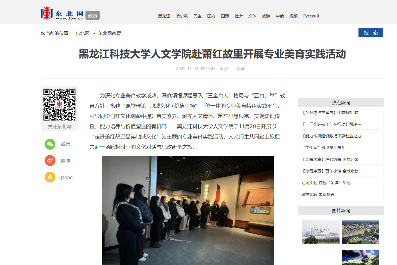 26/ 2025-11东北网:黑龙江科技大学人文学院赴萧红故里开展专业美育实践活动为深化专业美育教学成效,深度领悟课程思政“三全育人”格局与“五育并举”教育方针,搭建“课堂理论+地域文化+价值引领”三位一体的专业美育特色实践平台,引导同学们在文化溯源中提升审美素养、涵养人文情怀、筑牢思想根基,实现知识传授、能力培养与价值塑造的有机统一,黑龙江科技大学人文学院于11月20日开展以“走进萧红故里品读地域文化”为主题的专业美育实践活动,人文师生共同踏上旅程,共赴一场跨越时空的文化对话与...