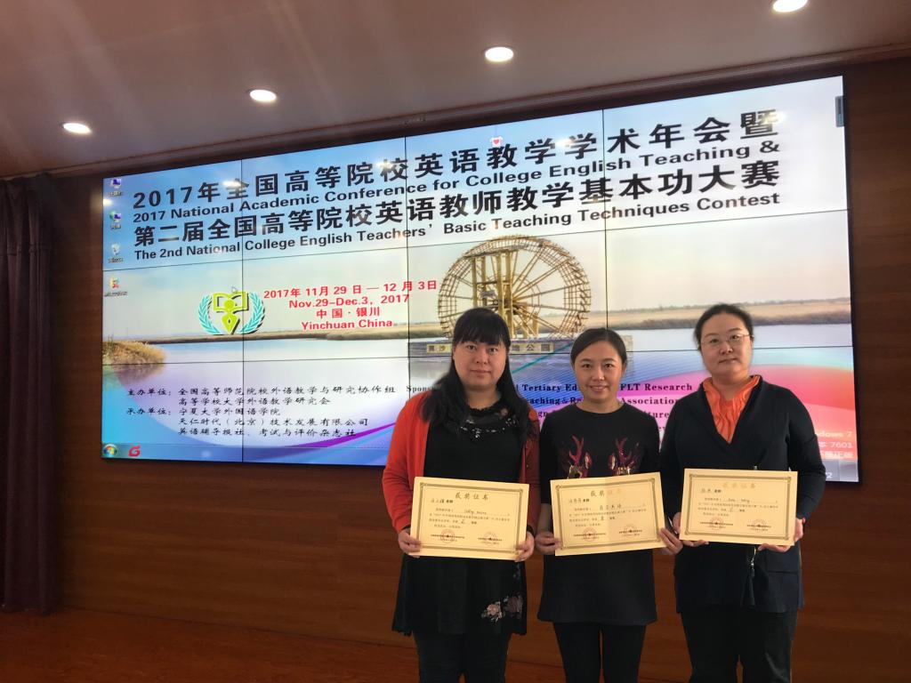 2017年12月,经国家教育部高教司批准的全国高等院校英语教学精品课大赛决赛在宁夏大学胜利举办。我校外国语学院教师冯菲菲获得一等奖,陆欣、马小骥获得二等奖。
