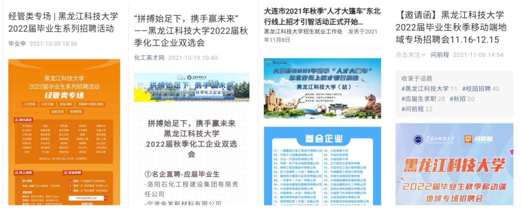 三是精准对接供岗位。开展“2022届高校毕业生就业促进月”活动,将校企精准对接作为当前就业工作重点。招就处部门领导和教师主动联系我校校企合作单位108家,搜集整理针对我校的招聘信息,发布岗位1020个,需求人数6827人。各学院按照岗位需求信息,“点对点”组织有意愿毕业生投递简历,招就处汇总统一发给用人单位。截止目前,累计投递简历552份。发动校友力量推动毕业生就业,如大连校友会发布“致学弟学妹一封信”,并组建“2022届黑科大大连校友会就业咨询群”,为毕业生提供就业岗位,解答求职疑惑。