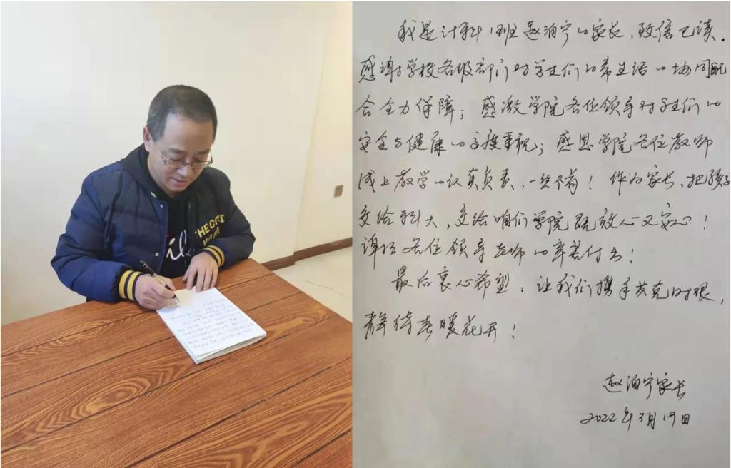 哈尔滨市疫情防控形势严峻,作为父母很是担心孩子的安全和健康,今悉贵校学院致家长的一封信,颇受感动。学校的疫情防控工作扎实有效,学校的封闭管理让我深感欣慰。师生同吃同住,餐饮供给充足,住宿条件优越,核酸采集规范有序,心理疏导缓解压力,作为学生家长看在眼里暖在心头。作为一名乡镇当党员干部,我也坚守在抗疫一线,非常理解学校学院为防疫做出的努力,我会积极引导孩子主动配合学院做好疫情防控,疏导孩子封校压力,及时掌握近期孩子学习生活状态,我坚信,在全校师生的共同努力下,战胜疫情,曙光就在前方!