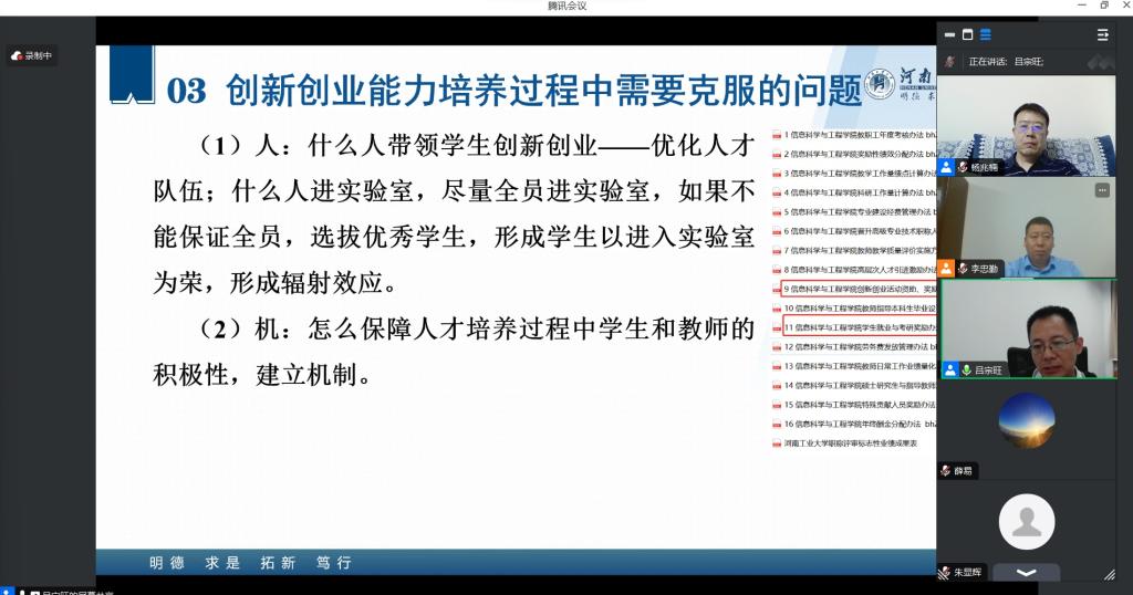为了提升我校大学生创新创业能力,提高教师指导大学生创新创业项目的工作成效,9月21日,创新创业学院与电气与控制工程学院共同邀请河南工业大学吕宗旺教授通过线上的形式做了关于“提升大学生创新创业能力的培养策略”的交流报告。报告从创新人才培养面临的问题出发,提出了从“人、机、物、法”四个方面破解问题的方法,并通过亲身实践的详实案例和做法为大家展示了如何培养创新型人才的路径,为我校教师提供了良好的借鉴和启发。最后与会教师关于创新实验班和创新实验室建设方面与吕教授进行了深入交流。