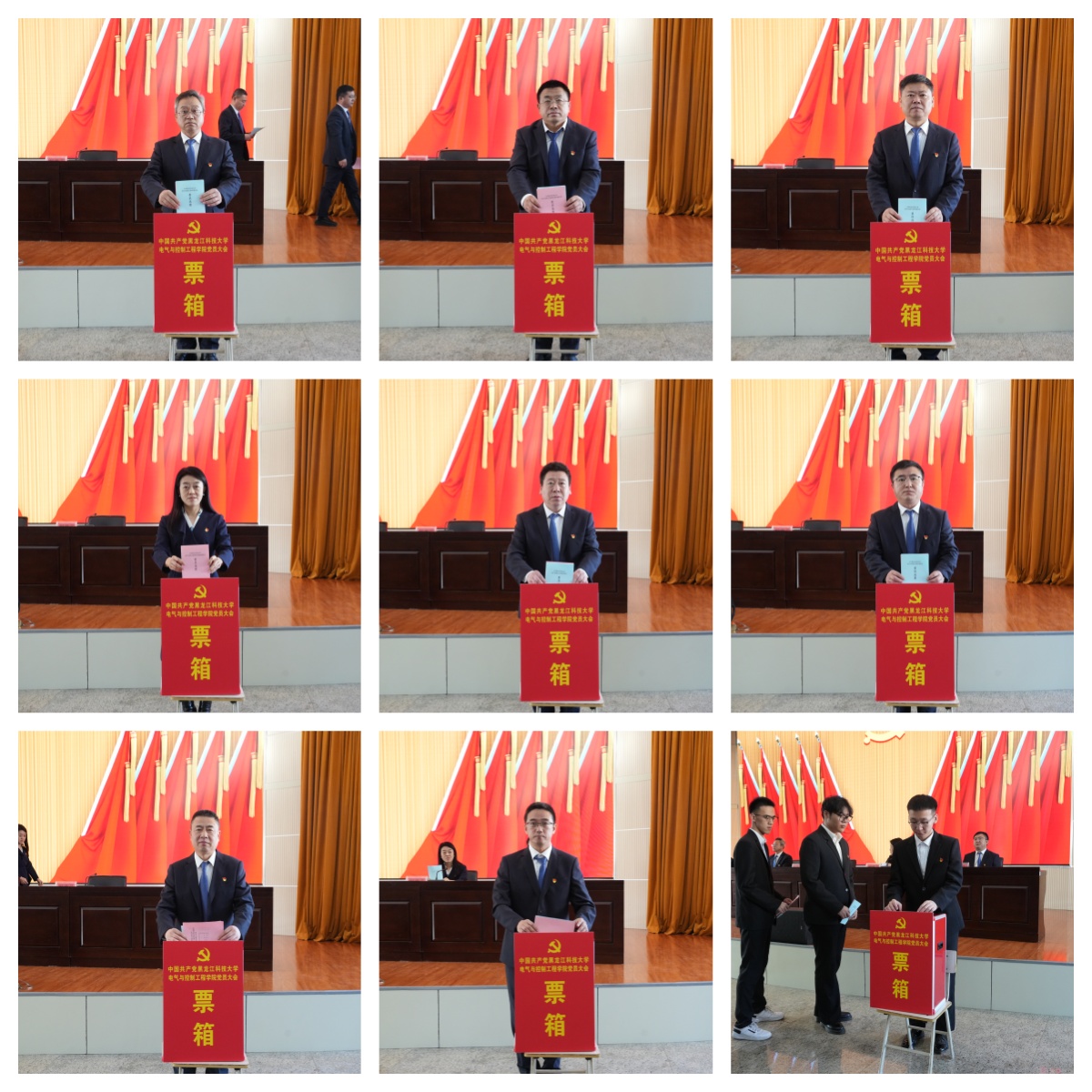 按照党内选举相关规定,与会正式党员通过无记名投票、差额选举的方式,选举产生了新一届中共黑龙江科技大学电气与控制工程学院委员会委员(以姓氏笔画为序):刘丹丹、苏勋文、李忠勤、李鹏银、沈显庆、侯树成、韩大伟;新一届中共黑龙江科技大学电气与控制工程学院纪律检查委员会委员(以姓氏笔画为序):李玉英、张孟洁、侯树成。