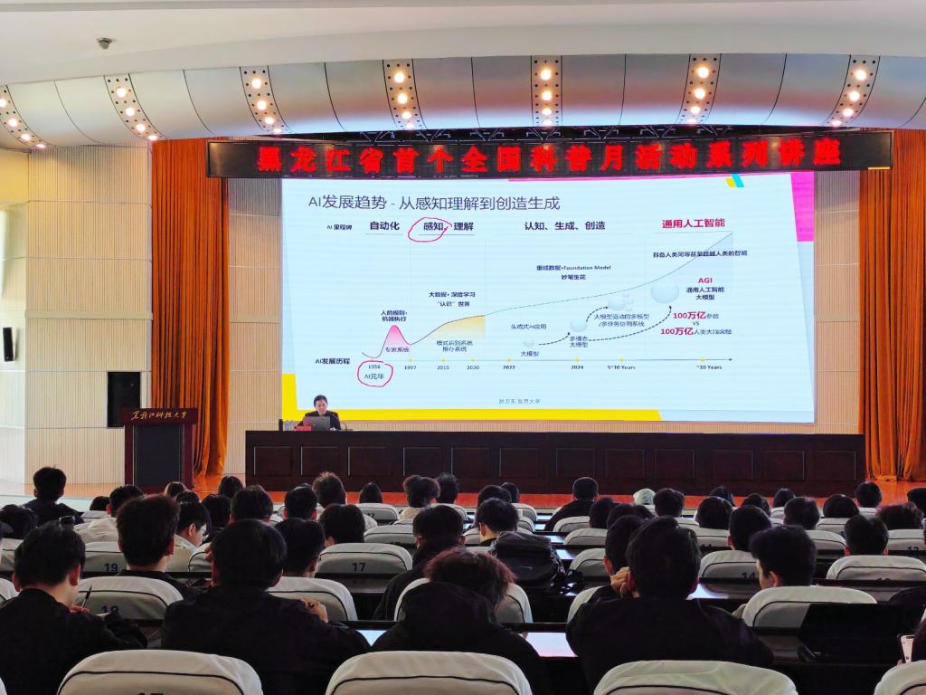 9月19日上午,外国语学院科协邀请复旦大学计算与智能创新学院教授作了题为“大模型赋能千行百业:发展与前瞻”的人工智能科普知识讲座,150余名师生积极参加。9月22日上午,外国语学院科协邀请东北林业大学计算机学院教授,作了题为“AI重塑视界:图形与虚拟现实的未来”的人工智能科普知识讲座,150余名师生聆听了讲座。讲座不仅是一次科学普及,更是一座连接学术、产业与未来应用的桥梁。