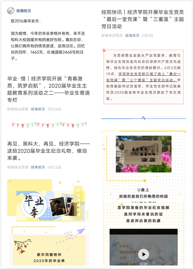 学院以“青春激昂 筑梦启航”为主题,相继开设“情系母校,乘帆远航”毕业生寄语专栏、开展“4年,1460天,科大记忆”、“殷殷母校情 依依学子心”文化作品征集、毕业生PS“云合影”、“写给十年后自己的一封信”、最后召开一次“云”班会、线上“最后一堂党课”暨“三个重温”主题党日等活动,“云端”开展的系列主题教育活动,为不能返校的毕业生搭建了记忆的平台,抒发了毕业情怀,共同回忆了四年的美好时光,营造了毕业季的良好文化氛围。
