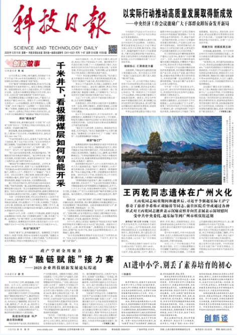 12月15日,《科技日报》以头版头条重磅报道我校“揭榜挂帅”科研团队攻坚成果,刊发题为《千米井下,看极薄煤层如何智能开采》的深度报道,全面展现我校在煤炭行业关键核心技术突破中的担当作为,这也是我校科研创新实力获得国家级权威媒体认可的重要体现。文章全文如下。