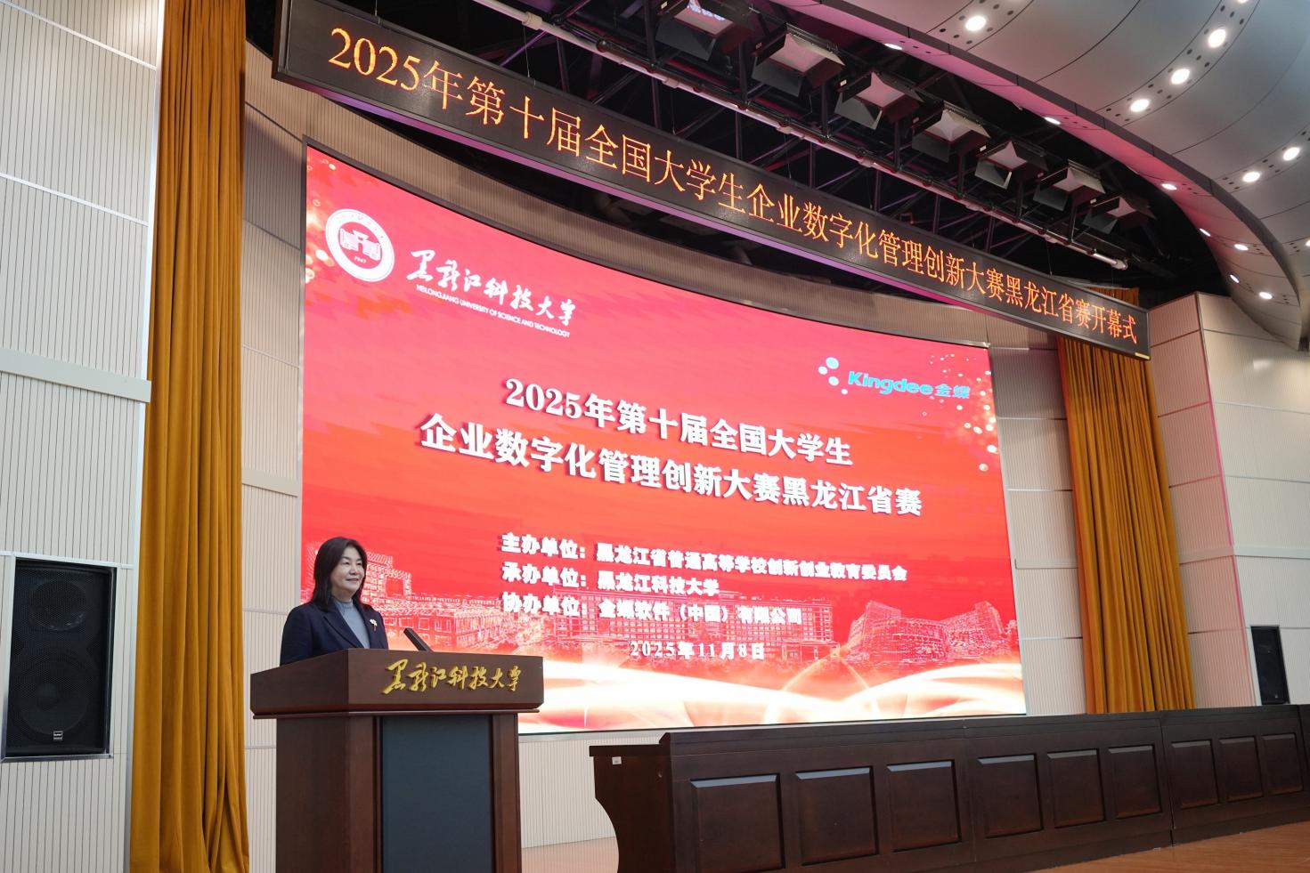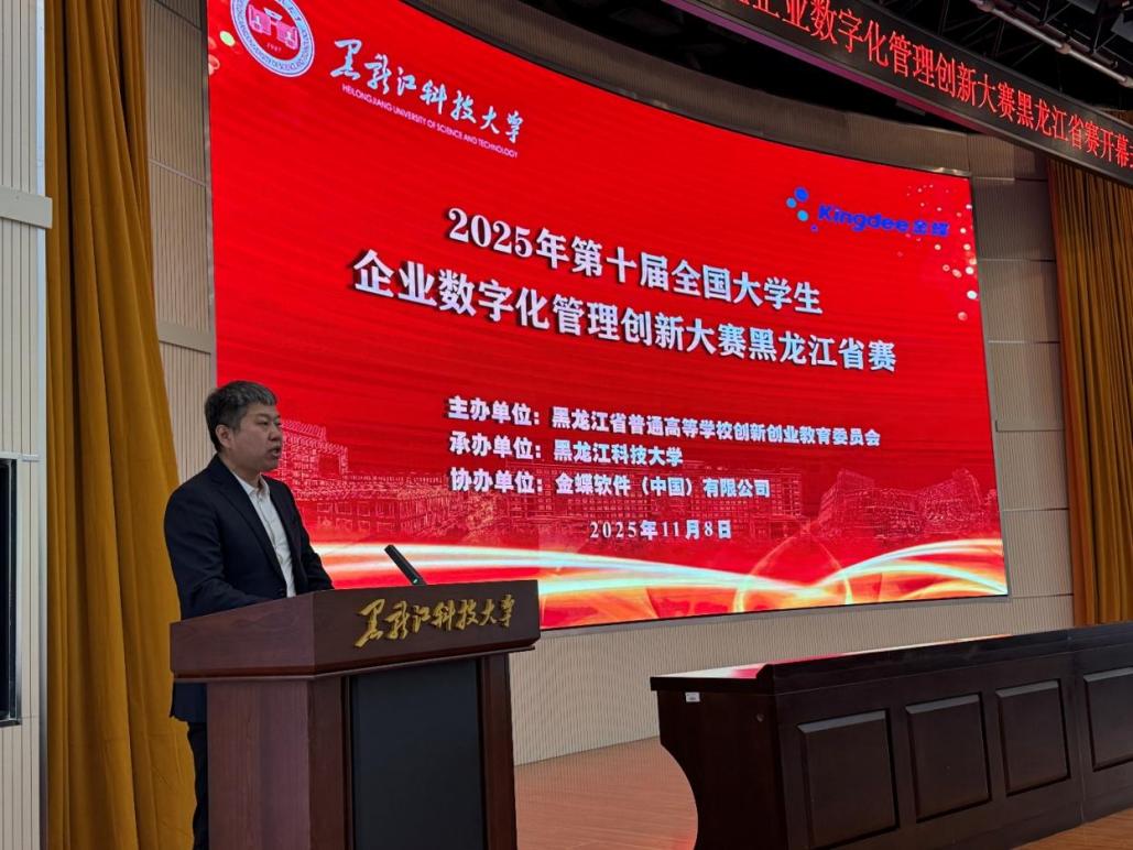 11月8日,由黑龙江省普通高等学校创新创业教育指导委员会主办,黑龙江科技大学承办,金蝶软件(中国)有限公司协办的2025年第十届全国大学生企业数字化管理创新大赛黑龙江省赛在我校顺利举行。学校副校长、党委常委谭旭红,金蝶软件(中国)有限公司黑龙江省公司副总经理孙振懿出席开幕式并致辞,学校双创学院院长谭平、管理学院院长洪亮和来自东北农业大学、东北石油大学、哈尔滨理工大学等省内18所院校的200余名参赛师生参加了开幕式。开幕式由管理学院副院长高太光主持。