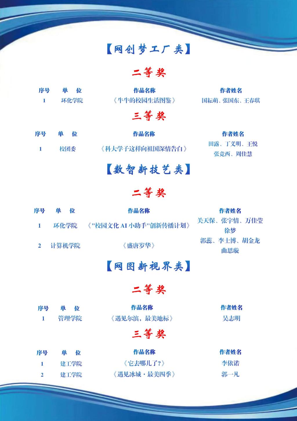此次评选中,我校青年学生在全省大学生网络文化节的光影趣青春、影像创意汇等7个赛道中表现夺目,共有31项作品获奖,其中,二等奖9项、三等奖22项;我校教师在全省高校网络教育优秀作品推选展示活动中成果丰硕,共有13项作品获奖,其中,二等奖5项、三等奖8项。获奖作品紧扣“争做校园好网民,汇聚网络正能量,奋进强国新征程”的主题,政治导向正确、内容积极向上、形式新颖多样,展现了科大青年让网络空间主旋律更加高昂、正能量更加充沛的青春风貌,凝聚了我校教师创新网络育人机制与载体,充分发挥网络文化活动滋养人心、凝聚力量的积极作用,彰显了我校网络文化建设的扎实成效与育人成果。