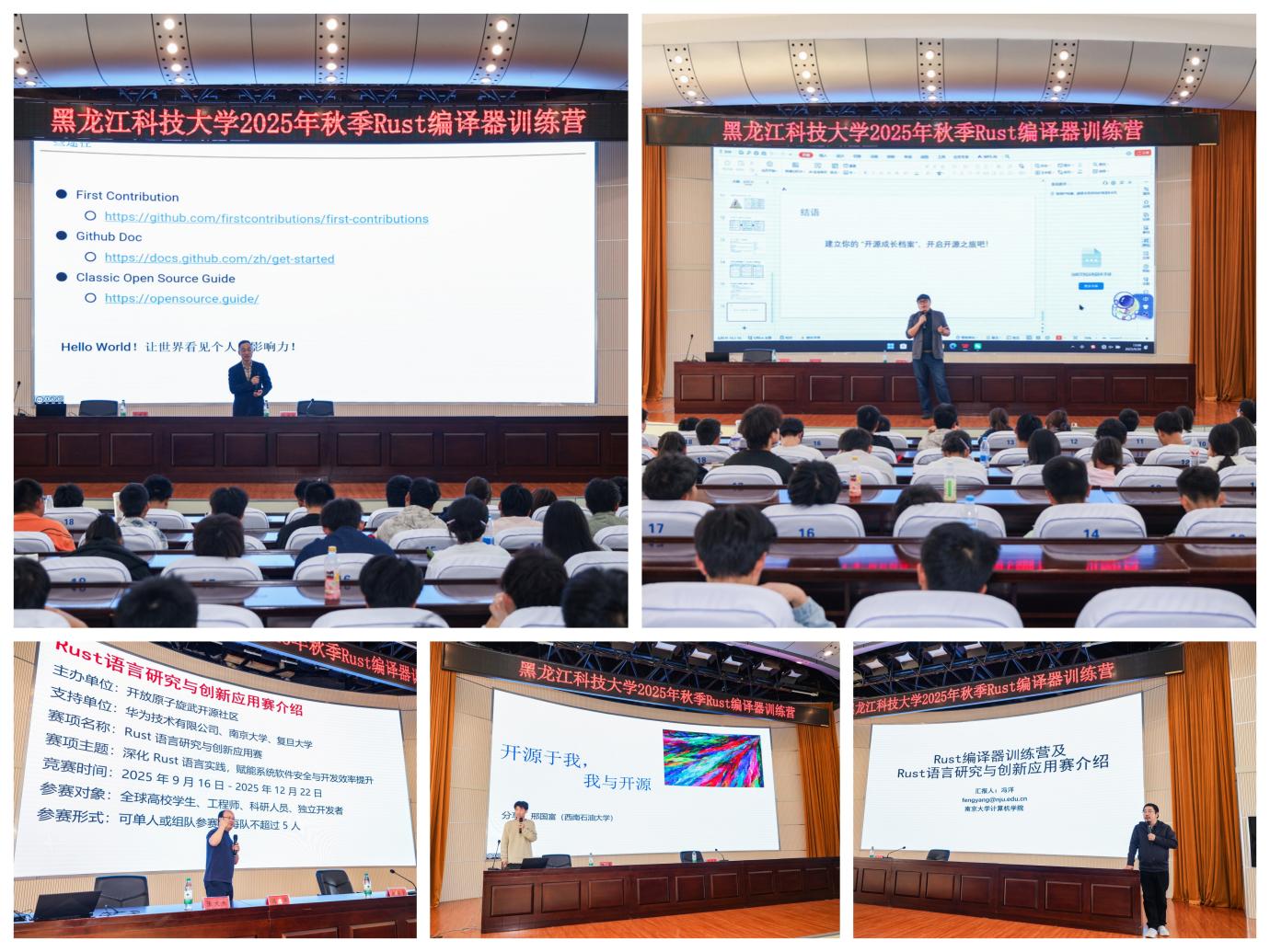9月20日,由计算机与信息工程学院承办的2025年秋季Rust编译器训练营在学校信息报告厅顺利举办。本次活动作为CCF校园行黑龙江科技大学站的核心环节,特邀华为专家马全一、联想集团张文杰、南京大学汪亮、冯洋、北京科技大学韩晓阳、西南石油大学邢国富等行业专家和精英担任讲师,学院200余名学生参与培训。