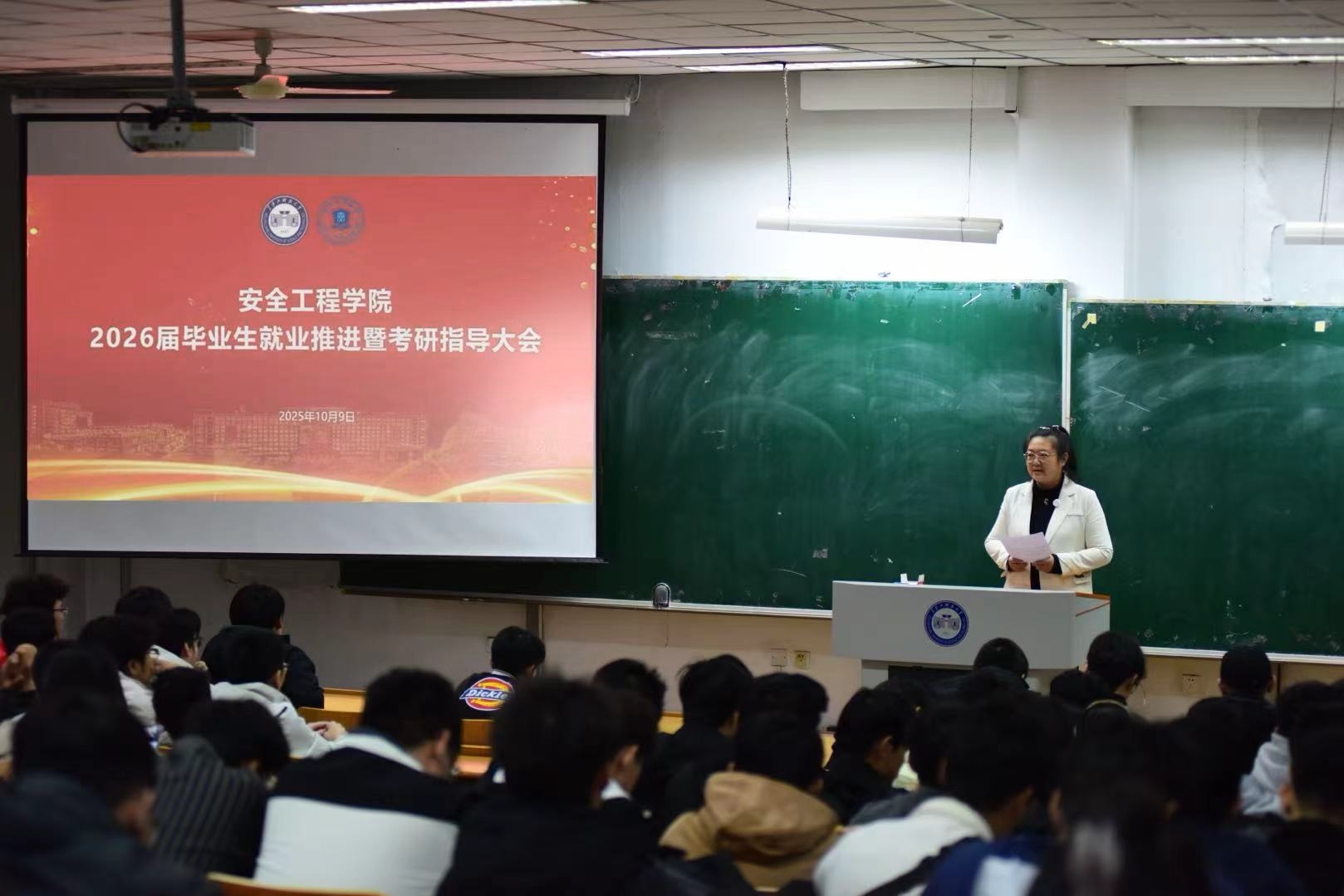 为持续做好2026届毕业生就业指导服务,深化学风建设、细致做好毕业生考研指导服务工作,10月9日,安全工程学院在科厦N101组织召开了2026届毕业生就业推进暨考研指导大会。学院副院长王亚军、就业辅导员薛广鑫及全体2026届毕业生参加会议,会议由毕业年级辅导员刘科然主持。