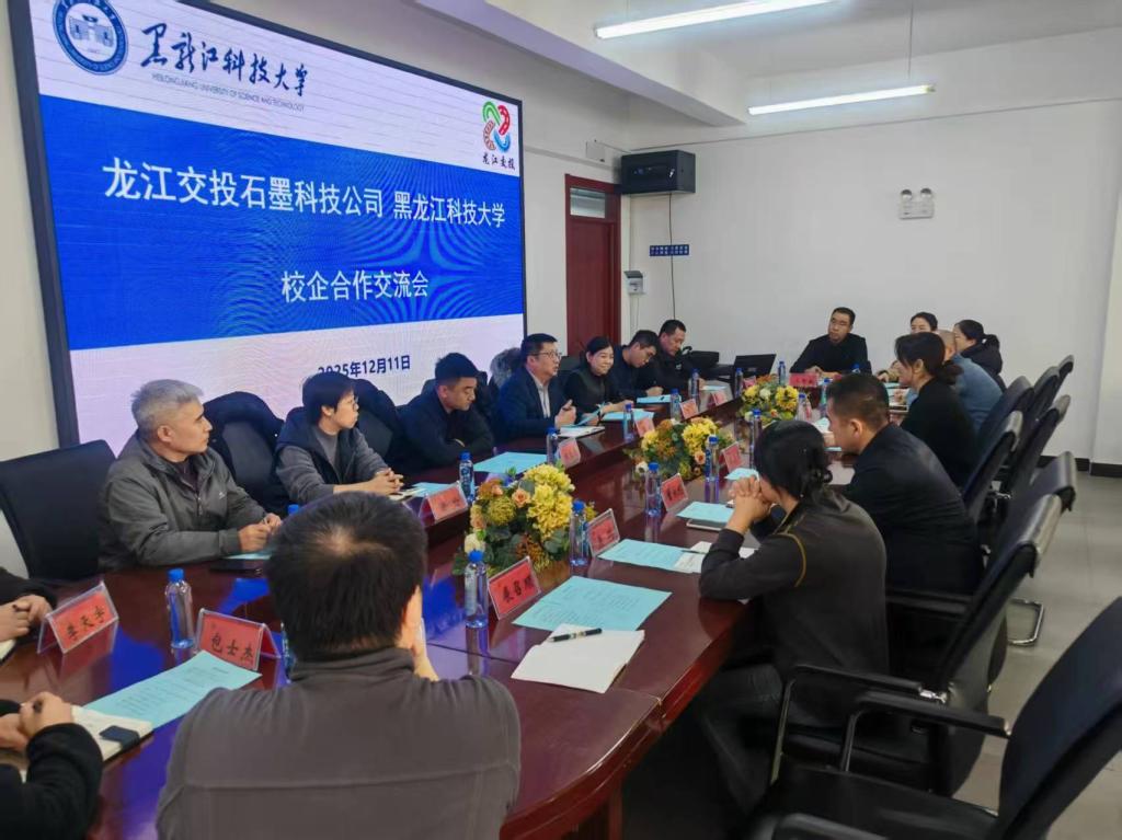 在2024年校企产学研党建共建联盟合作基础上,为进一步促进产学研融合,深化校企合作和科技成果转化,12月11日,龙江交通石墨科技公司副总经理杨帆(兼龙创新材料公司董事长)、副总经理吕雪(兼石墨创新中心公司总经理)及石墨创新中心公司副总经理徐丹和李泽一行,来到我校环境与化工学院进行了交流考察。环境与化工学院党委书记苗雨、副院长董永利,矿业工程学院副院长商宇航,材料科学与工程学院副院长马志鹏及三个学院的8名科研骨干教师参加了交流座谈。