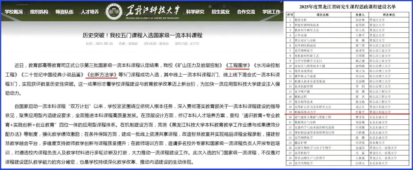 8月21日,教育部高等教育司发布了《关于第三批国家级一流本科课程认定结果的公示》,冯旻教授负责的《工程图学》课程入选“线上线下混合式一流课程”,王妍玮教授负责的《创新方法学》课程入选“线上一流课程”;11月24日,任春平副教授负责的《机械系统动力学》课程获批“黑龙江省研究生课程思政课程”。