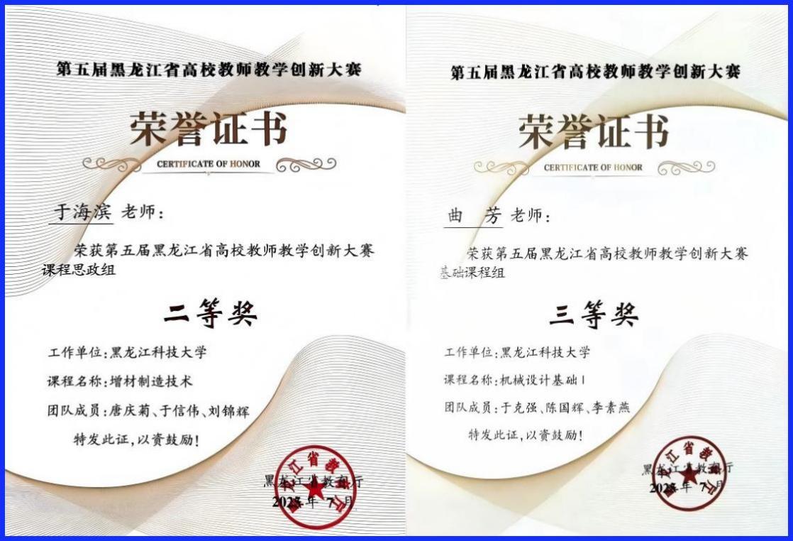 4月28日,在黑龙江省第五届教学创新大赛中,于海滨、曲芳分别获得二等奖、三等奖;12月18日,在学校第六届教学创新大赛中,2人获得一等奖,3人获得二等奖。