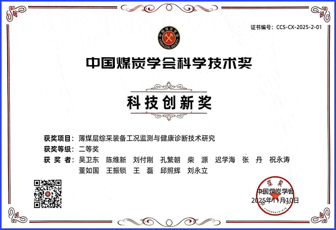 中国煤炭学会科技奖证书