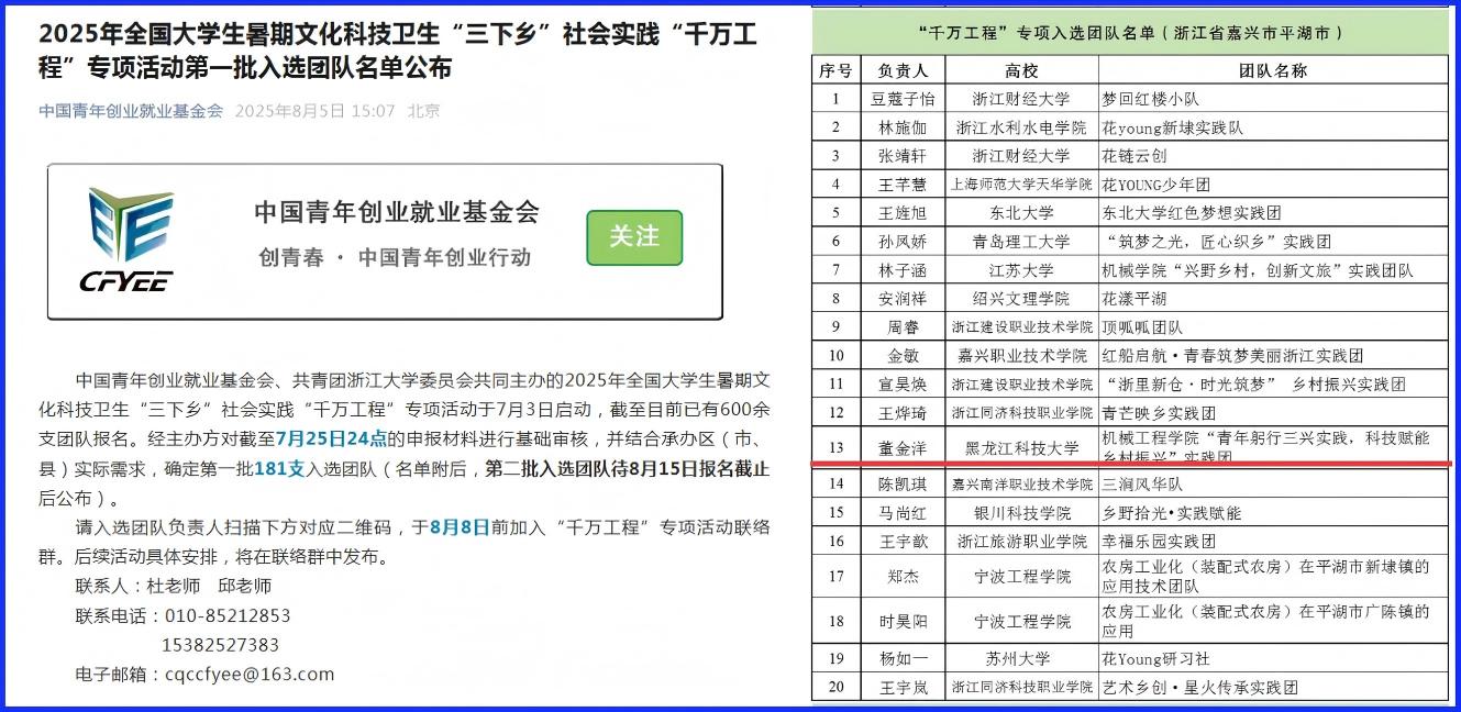 8月5日,学院“青年躬行三兴实践,科技赋能乡村振兴”实践团队被成功确定为2025年全国大学生暑期文化科技卫生“三下乡”社会实践“千万工程”专项活动第一批入选团队。