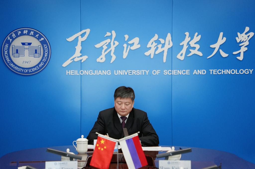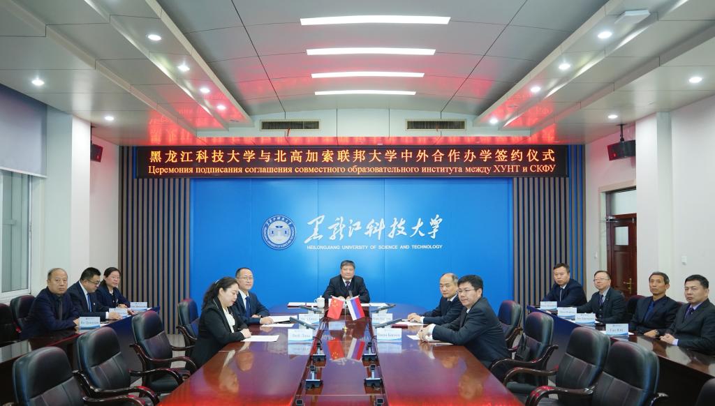库穆科夫介绍了“智能工程国际学院”的办学层次、开设专业、招生规模、授课语言、学位授予等情况。随后,在双方参会人员的共同见证下,孟上九与舍布祖霍娃代表两校签署了《中外合作办学机构“黑龙江科技大学智能工程国际学院”协议书》,标志着两校合作进入全新阶段。双方校长在总结致辞中一致表示,将以此次签约为契机,推动师资互访、科研创新、学生交流等方面的务实合作,努力打造高质量的中俄合作办学机构。