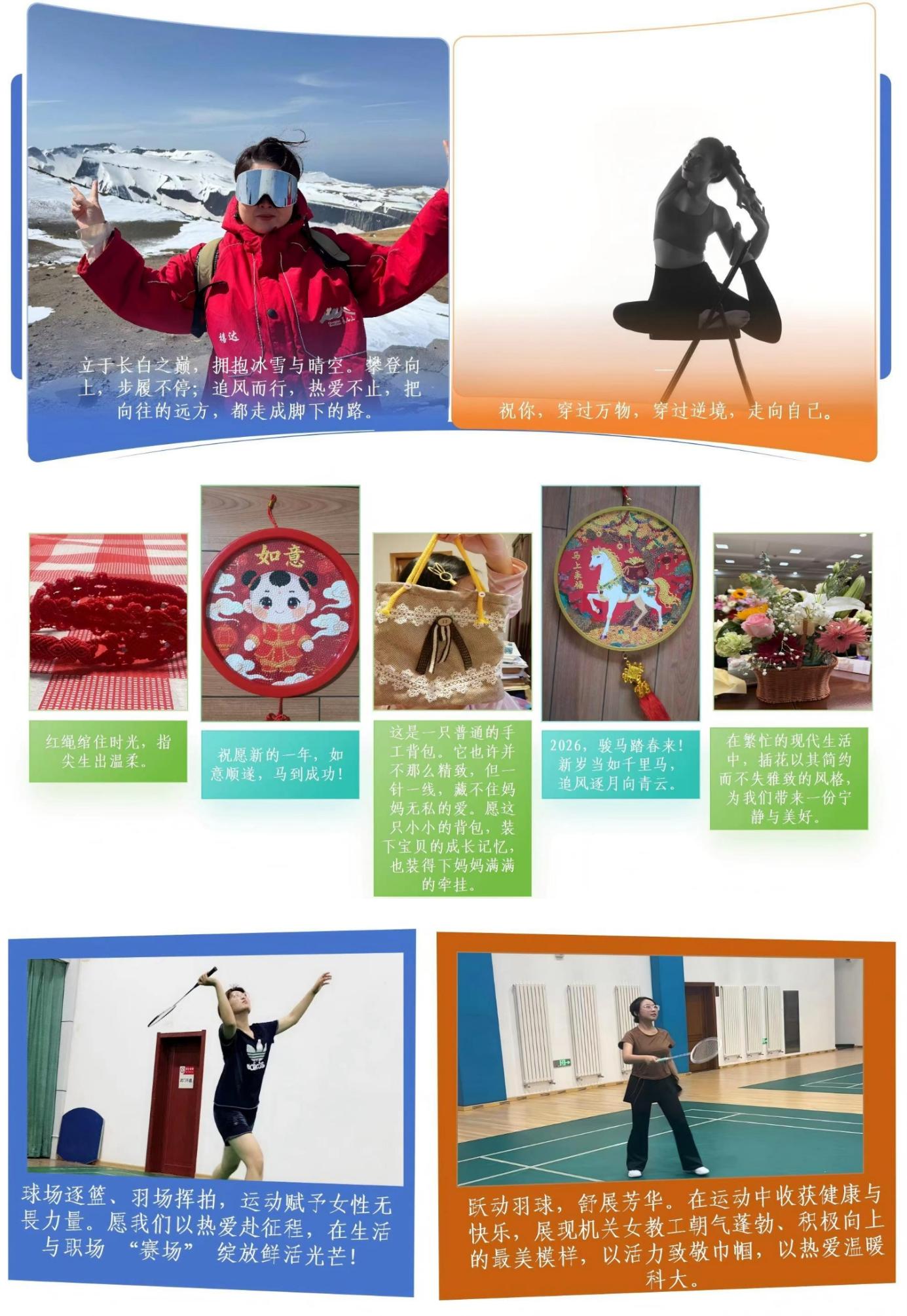 机关工会开展了“巾帼绽芳华·风采暖科大”女教职工业余生活风采展示活动。投稿作品题材丰富、视角多元,或定格运动场上的活力瞬间、或记录生活雅趣的温馨画面、或展现才艺舞台的绰约风姿,多角度呈现了机关女教职工奋发有为、热爱生活的新时代风采,营造了温馨和谐的节日氛围。