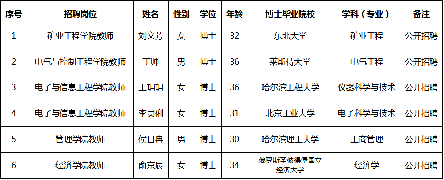 按照《黑龙江省事业单位公开招聘工作人员实施细则》的规定,根据《黑龙江科技大学2026年上半年公开招聘博士教师公告》明确的原则、程序和方法,现将拟聘用人员予以公示。如对公示人员有异议,可在公示期内反映,反映情况和问题必须实事求是,应签署或告知真实姓名、工作单位和联系方式。对线索不清的匿名信和匿名电话,公示期间不予受理。