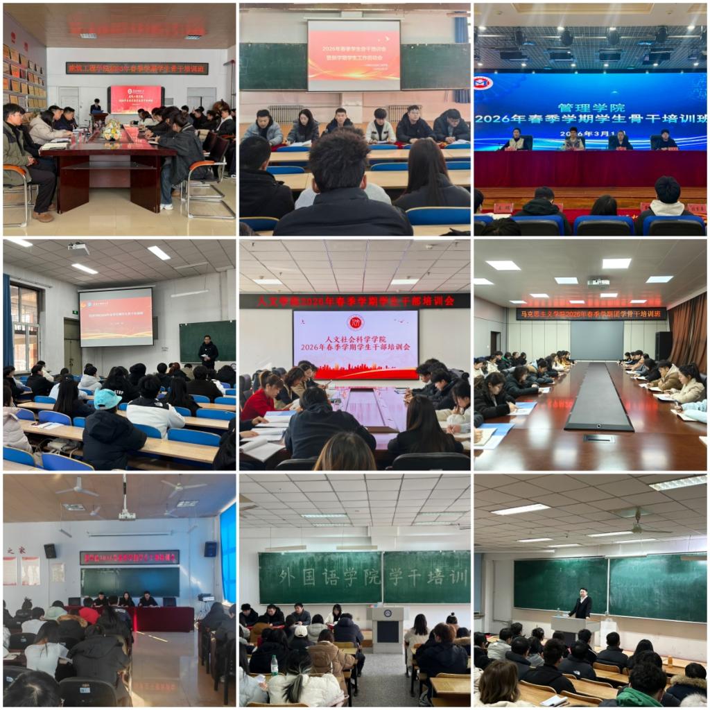 2月28日至3月1日,学工部(处)、校团委、各学院重点围绕传达学习校级培训班精神,部署开学启动及2026年学团重点工作,提升工作本领等内容,对校院班三级团学组织骨干进行了全覆盖式培训。