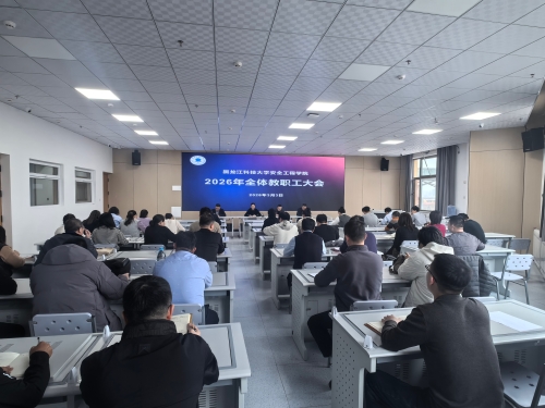04/ 2026-03安全工程学院召开2026年春季学期全体教职工大会3月3日上午,安全工程学院在学院718室召开春季学期全体教职工大会,部署安排本学期重点工作。学院领导班子及全体教职工参加会议,会议由学院党委书记王娟主持。会议现场会上,王娟传达了学校党委二届十次全体会议精神及学校二届三次教职工代表大会暨2026年度工作部署会议精神,组织开展了3月份全体教职工政治理论学习。副院长王亚军安排布置了新学期科研、学科和研究生管理工作;党委副书记郑红岩就学生管理和工会工作进行了安排部署;院长徐锋对学院行政工作进行了全面部署,重点围绕博士授权点申报、第六轮...