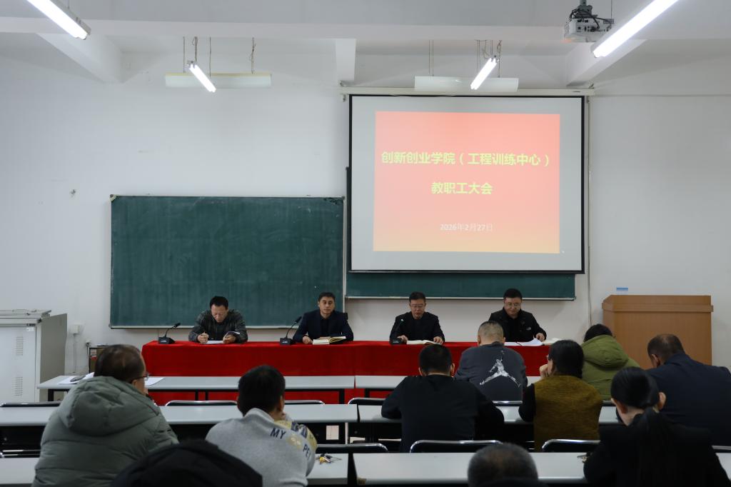 03/ 2026-03策马扬鞭启新程 开局起步就争先——创新创业学院召开2026年春季学期教职工大会为明确工作方向、凝聚奋进力量,深入贯彻学校党委二届十次全委会及学校二届三次教职工代表大会暨2026年度工作部署会议精神,2月27日,创新创业学院在实训楼320室召开了新学期教职工大会,院长谭平主持会议,全体教职工参会。 职工大会现场 会上,副院长杨兆楠总结了假期创新创业教育工作开展情况,安排了新学期大创项目立项、学科竞赛启动等任务;副院长李立欣通报了假期教育教学及实验室改造、设备更新调试进展,部署了开学教学准备与实验室安全检查等工作;副院长韩大伟梳理了假期党...