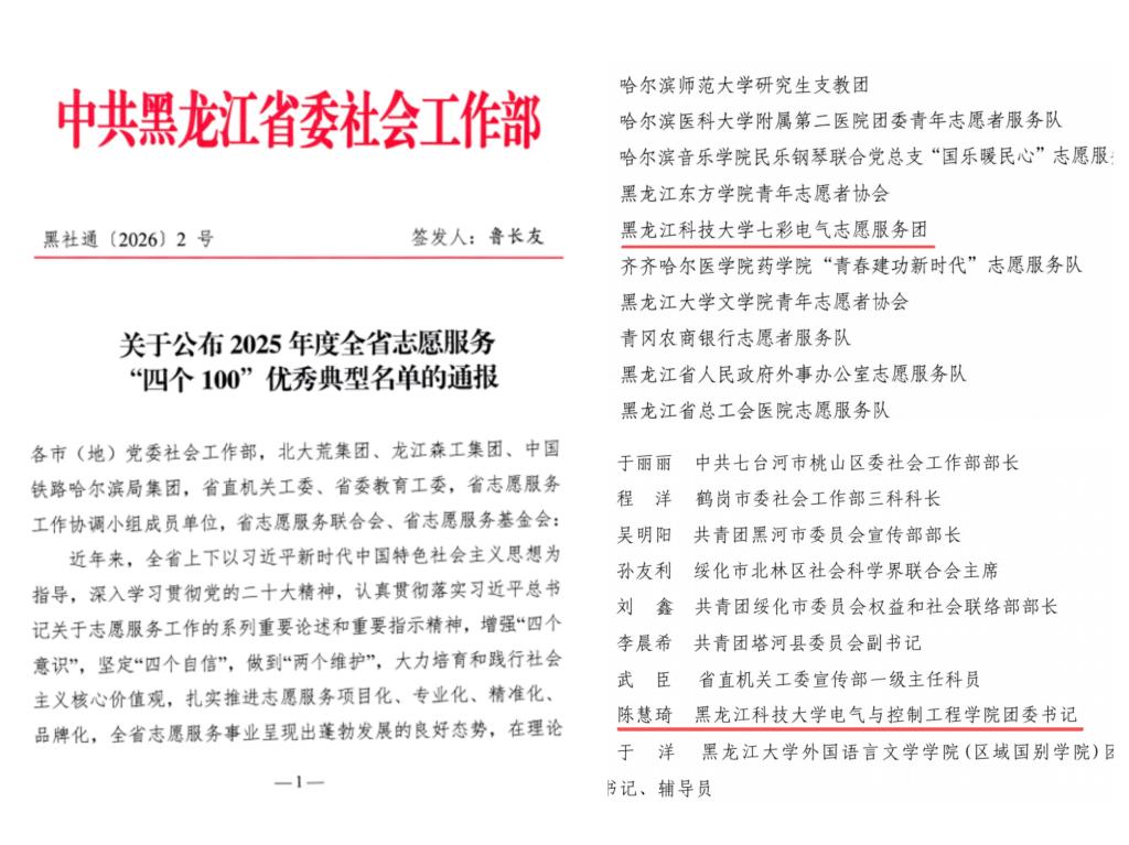 近日,由中共黑龙江省委社会工作部、黑龙江省志愿服务基金会组织的2025年度全省志愿服务“四个100”评选活动中,我校电气与控制工程学院七彩电气志愿服务团获评“优秀志愿服务组织”,学院团委书记陈慧琦荣获“优秀志愿服务工作者”,实现集体与个人双获省级殊荣。