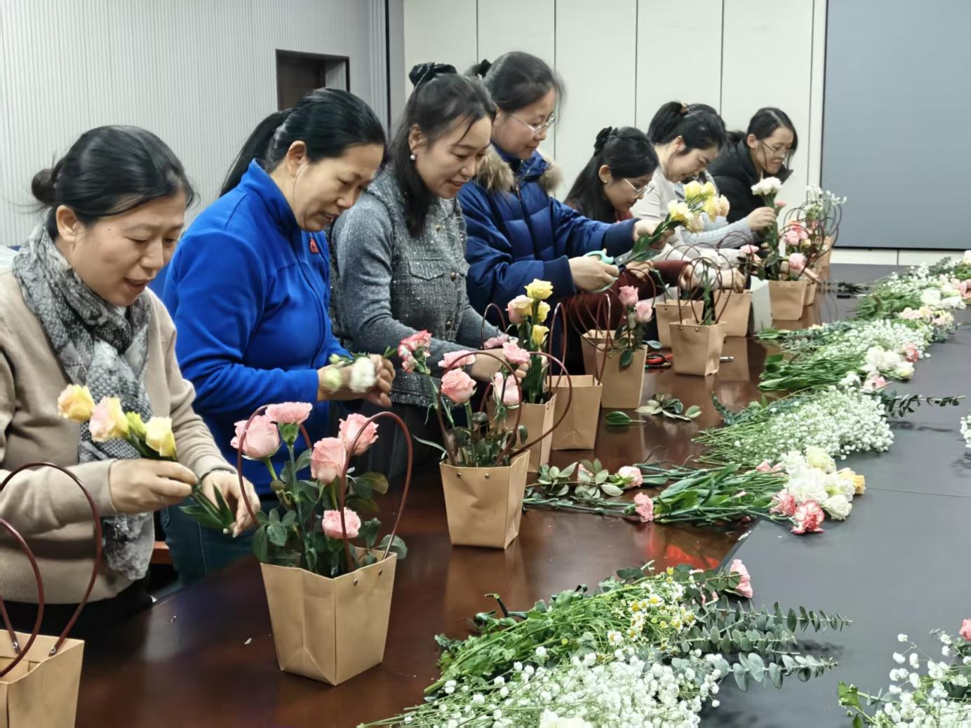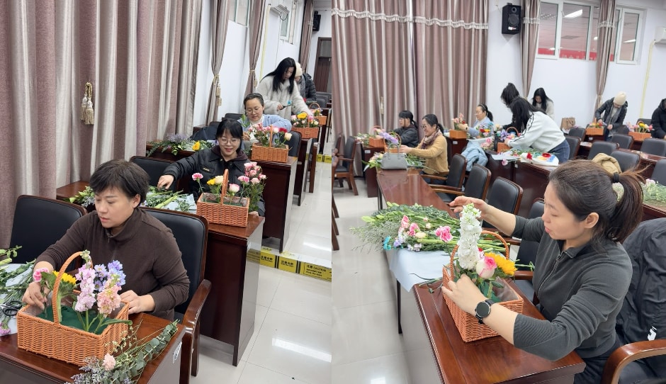 矿业工程学院工会开展了“花漾芳华 指尖生春”插花沙龙活动。女教职工们将一朵朵鲜艳的康乃馨、清雅的小雏菊、蓬勃的非洲菊等花材,错落有致地插入精巧的藤编花篮中,指尖流淌的是对生活的热爱,眉宇间绽放的是为人师者的温润光华。
