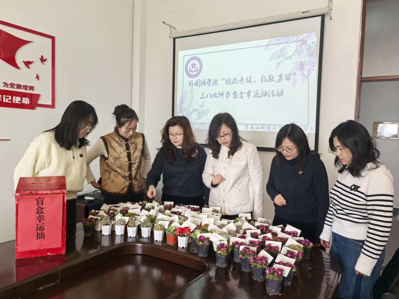 外国语学院工会开展了“植此青绿,致敬芳华”三八节春日盲盒幸运抽活动。女教师们自主抽取奖券兑换绿植盲盒,自愿与绿植合影打卡,现场氛围温馨愉悦,活动以绿植盲盒的趣味形式,传递了学院对女教师的关怀。