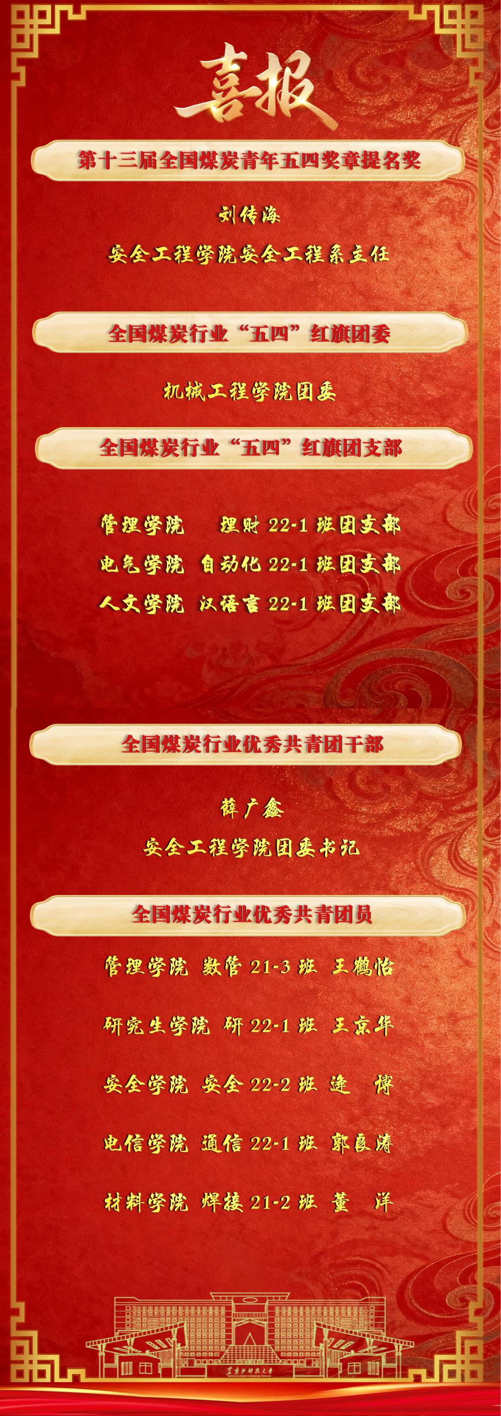 在本次评选中,安全学院刘传海教授获第13届“全国煤炭青年五四奖章”提名;机械工程学院团委荣获“全国煤炭行业五四红旗团委”;电气学院自动化22-1班团支部等3个团支部获评“全国煤炭行业五四红旗团支部”;安全学院团委书记薛广鑫被评为“全国煤炭行业优秀共青团干部”;管理学院王鹤怡等5名共青团员被评为“全国煤炭行业优秀共青团员”。