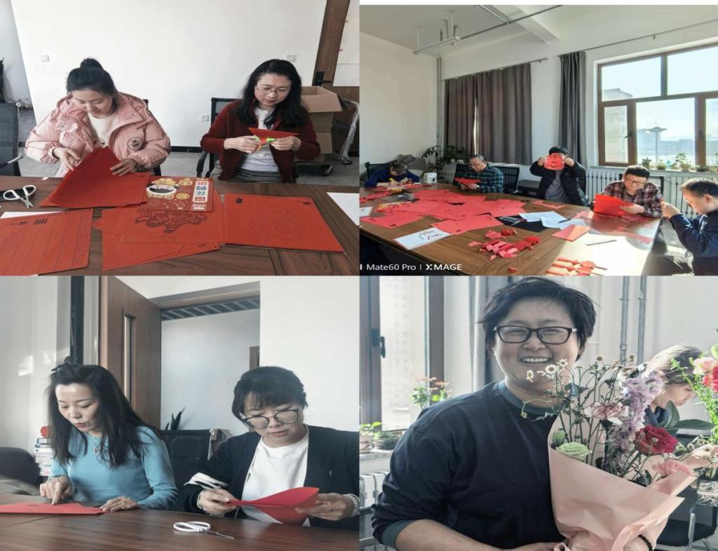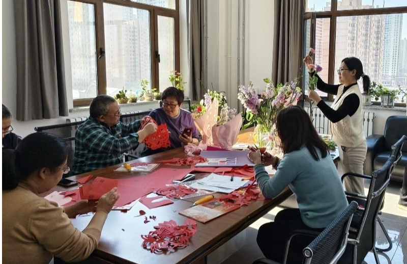 插花环节生机盎然,花香萦绕。活动中,教师们从色彩搭配到造型技巧,从花材修剪到层次布局,每一个步骤都体现了细心与巧思。大家一边交流创作心得,一边用心打造专属花艺作品。原本零散的花草,在一双双巧手下逐渐变成了清新雅致、温润精美的插花作品。花香与笑语交织,温馨与美好相伴,大家在活动中舒缓身心、陶冶情操。剪纸体验区更是热闹非凡,一张张普通的红纸在灵巧的双手间翻转折叠,一幅幅线条流畅、寓意美好的剪纸作品,伴随剪刀的起落逐渐呈现。红纸裁出新意,匠心传递温情,教师们纷纷表示剪纸锻炼了动手能力与审美素养,领略了传统民间艺术的独特韵味,度过了一个充实而有意义的节日。